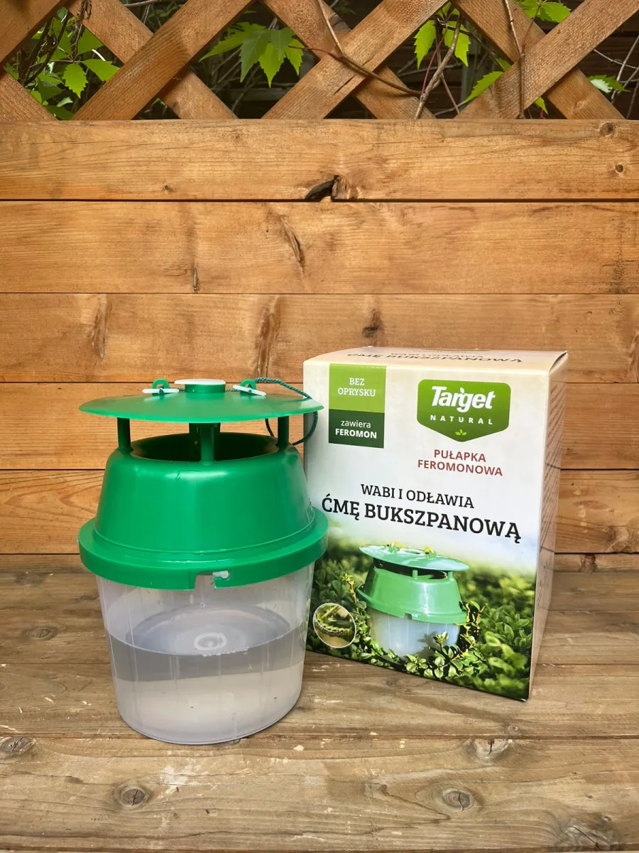 Pułapka feromonowa jest świetnym rozwiązaniem w ogrodzie do monitorowania i wyłapywania dorosłych samców ćmy bukszpanowej. Feromon w takich pułapkach umieszcza się w specjalnym koszyczku - przyciąga on wyłącznie samce, co zapobiega zapłodnieniu samic a tym samym składaniu przez nie jaj, dzięki temu poza samą możliwością monitorowania ciem ograniczamy liczebność nowych larw. Jedna pułapka wystarcza na obszar o powierzchni około 300-500 m². Wkład feromonowy należy wymieniać co 4-6 tygodni (w sklepach można kupić same wkłady - nie ma potrzeby kupowania całych nowych pułapek)