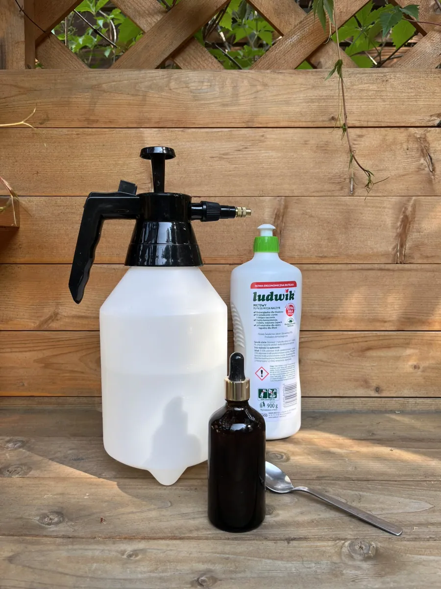 - Oprysk z dodatkiem mydła: W 2 litrach ciepłej wody rozpuść 1 łyżeczkę sody oczyszczonej i kilka kropli płynu do naczyń lub kawałek szarego mydła.