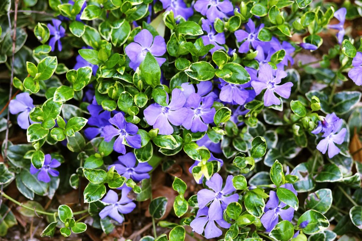 - Barwinek pospolity - roślina płożąca mogąca rozrosnąć się na szerokość pół metra. Posiada delikatne kwiatki - białe, fioletowe lub niebieskie. Jest mrozoodporny, dlatego jego ciemnozielone liście będą zachwycać również w czasie bezśnieżnych zim. Szybko się rozmnaża, więc warto pilnować, aby inne rośliny nie zostały przez niego zdominowane.